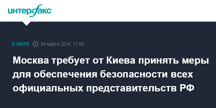 Москва. 24 марта. INTERFAX.RU - Россия требует от властей в Киеве принять меры для обеспечения безопасности всех официальных представительств РФ на территории Украины, заявили в российском дипведомстве.