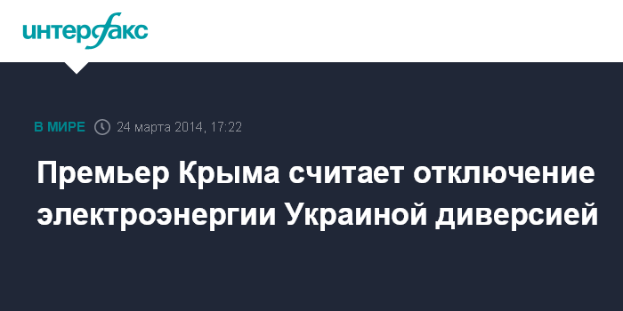 Москва. 24 марта. INTERFAX.RU - Премьер-министр Крыма Сергей Аксенов заявил, что власти региона считают действия Украины по ограничению поставок электричества в республику диверсией.