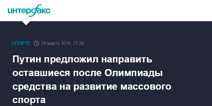 Москва. 24 марта. INTERFAX.RU - Средства, оставшиеся в бюджете после Олимпиады, и прибыль, полученная от олимпийских объектов, должны пойти на развитие массового спорта, заявил президент России Владимир Путин.
