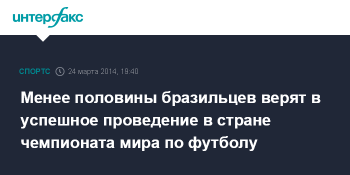 Москва. 24 марта. INTERFAX.RU - Каждый четвертый бразилец считает, что чемпионат мира по футболу 2014 года, который пройдет этим летом в Бразилии, получится плохим.