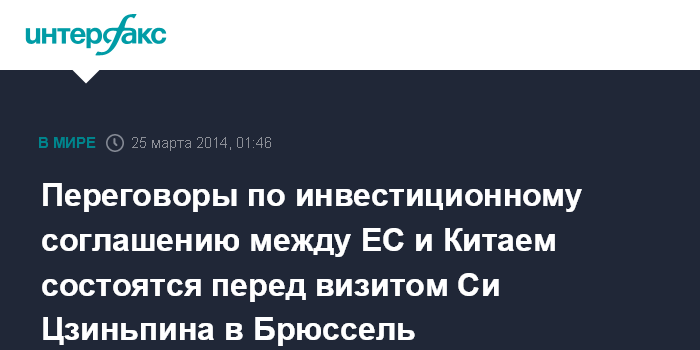 Брюссель. 25 марта. INTERFAX.RU - В преддверии первого в истории визита председателя Китайской Народной Республики в руководящие институты Евросюза 24-25 марта в Брюсселе состоится второй раунд переговоров по инвестиционному соглашению между ЕС и Китаем.