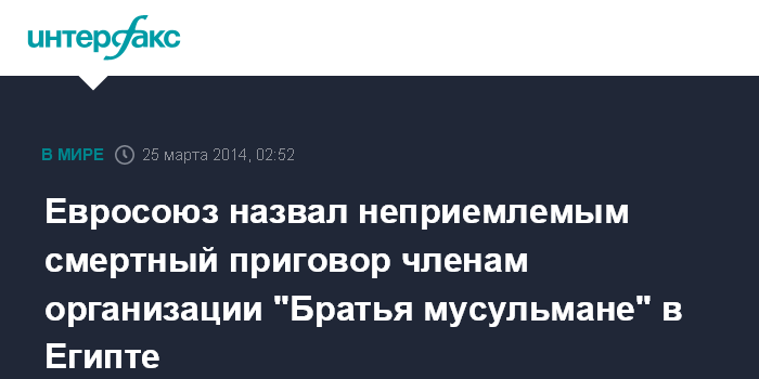 Брюссель. 25 марта. INTERFAX.RU - Европейский союз назвал неприемлемым смертный приговор 529 членам организации "Братья мусульмане" в Египте, и призвал обеспечить их права в соответствие с международными стандартами.
