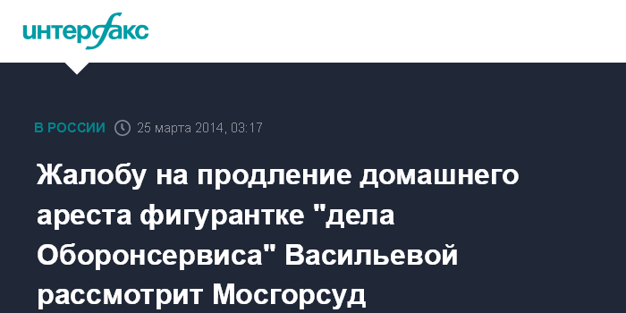 Москва. 25 марта. INTERFAX.RU - Мосгорсуд проверит законность продления домашнего ареста экс-руководителя департамента имущественных отношений Минобороны Евгении Васильевой, ключевой фигурантки "дела Оборонсервиса".