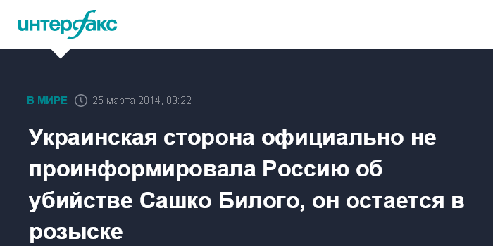 Москва. 25 марта. INTERFAX.RU - Российские правоохранительные органы не получали официального уведомления об убийстве на Украине националиста Александра Музычко, известного как "Сашко Билый", поэтому он по-прежнему остается в международном розыске по заочному обвинению в бандитизме и создании оргпреступной группы, сообщил "Интерфаксу" источник в силовых структурах РФ.