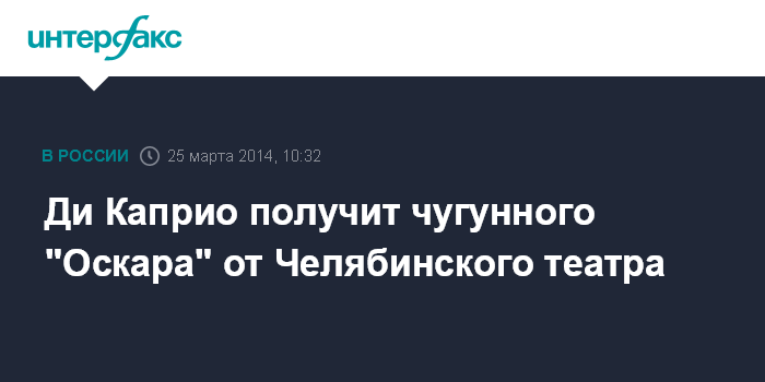 Москва. 25 марта. INTERFAX.RU - Челябинский камерный театр отправит голливудскому актеру Леонардо ди Каприо статуэтку, напоминающую "Оскара", сообщил во вторник агентству "Интерфакс-Урал" замдиректора театра по связям с общественностью Юрий Сычев.
