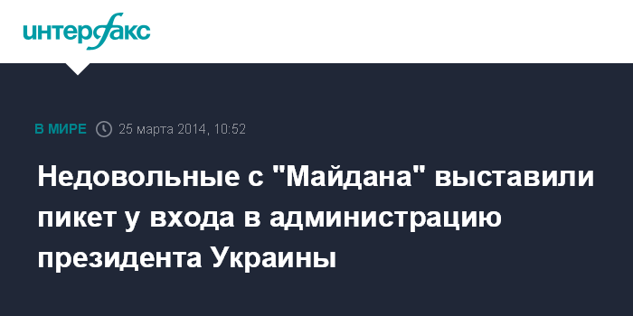 Москва. 25 марта. INTERFAX.RU - Около 20 представителей общественного объединения "Майдан" протестуют во вторник утром у администрации президента Украины в Киеве против квотного принципа распределения властных должностей.