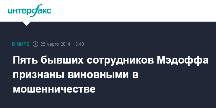 Нью-Йорк. 25 марта. INTERFAX.RU - Суд присяжных Нью-Йорка признал пять бывших сотрудников создателя финансовой пирамиды Бернарда Мэдоффа виновными в мошенничестве, пишет газета The Wall Street Journal.