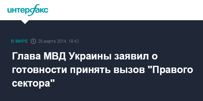 Москва. 25 марта. INTERFAX.RU - Министр внутренних дел Украины Арсен Аваков заявляет, что "Правый сектор" ему угрожает, но он "принимает вызов". Его позиция к тем, кто нарушает общественный порядок, будет достаточно жесткой.