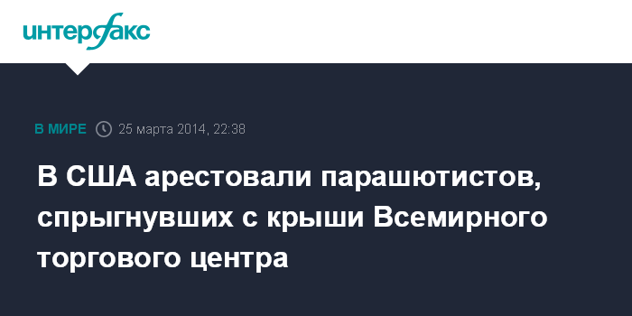 Вашингтон. 25 марта. INTERFAX.RU - Четыре человека, спрыгнувших с парашютом с крыши здания Всемирного торгового центра-1 в Нью-Йорке, явились с повинной в полицию, передает во вторник агентство AP.