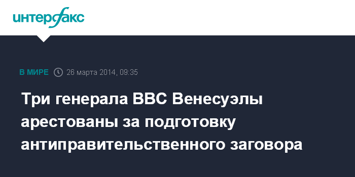 Москва. 26 марта. INTERFAX.RU - Полиция Венесуэлы арестовала трех поддерживающих оппозицию генералов ВВС, сообщают в среду латиноамериканские СМИ.