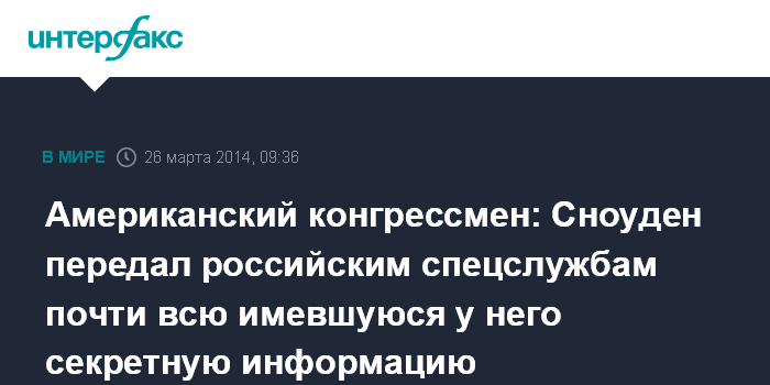 Москва. 26 марта. INTERFAX.RU - Представители российских спецслужб, скорее всего, получили доступ к большей части секретной информации, которая была в распоряжении экс-сотрудника ЦРУ и АНБ Эдварда Сноудена, сказал журналистам председатель комитета по делам разведки в палате представителей Конгресса США Майк Роджерс.