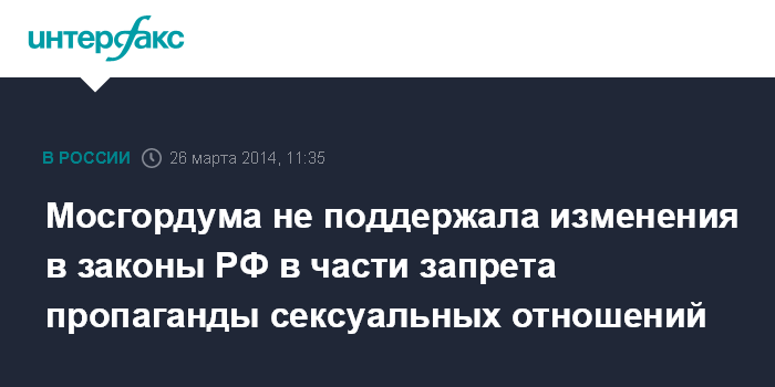 Москва. 26 марта. INTERFAX.RU - Мосгордума на заседании в среду не поддержала законопроект, вносящий изменения в федеральные законы в части запрета распространения среди несовершеннолетних информации, пропагандирующей приоритет сексуальных отношений.