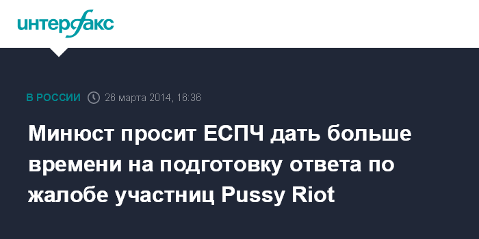 Москва. 26 марта. INTERFAX.RU - Минюст России попросил Европейский суд по правам человека (ЕСПЧ) продлить срок подготовки ответа на вопросы по жалобе защиты трех участниц панк-группы Pussy Riot, сообщили в пресс-службе министерства.