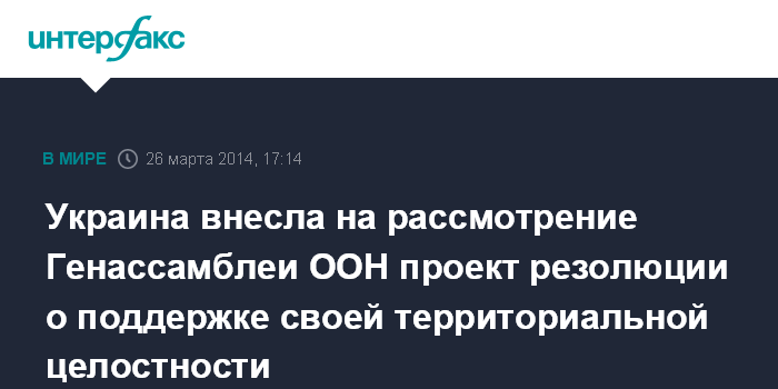 Москва. 26 марта. INTERFAX.RU - Украина внесла на рассмотрение Генассамблеи ООН проект резолюции по поддержанию территориальной целостности страны, сообщают в министерстве иностранных дел Украины.
