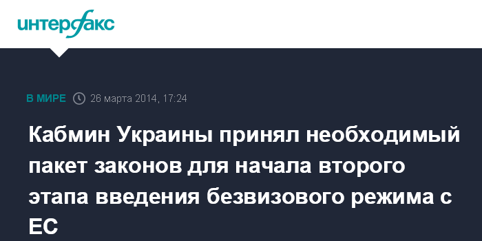 Москва. 26 марта. INTERFAX.RU - Правительство Украины одобрило необходимые законопроекты и нормативные акты для начала второго этапа введения безвизового режима с Европейским союзом.