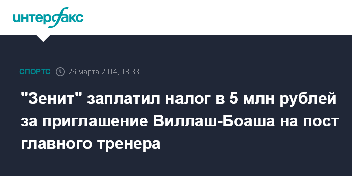 Москва. 26 марта. INTERFAX.RU - Футбольный клуб "Зенит" заплатил полагающийся налог за нового главного тренера португальца Андре Виллаш-Боаша, сумма составила 5 миллионов рублей, сообщил председатель Объединения отечественных тренеров Михаил Гершкович.
