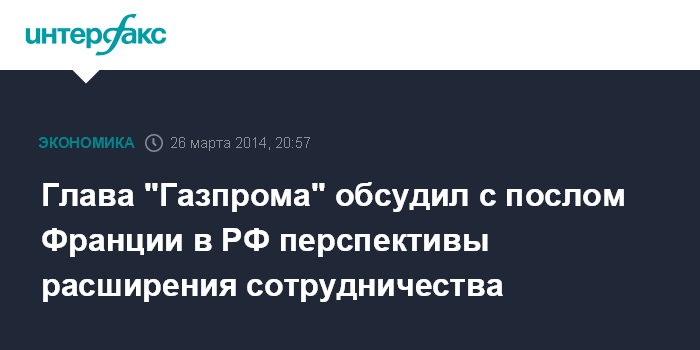 Москва. 26 марта. INTERFAX.RU - Глава "Газпрома" Алексей Миллер и посол Франции в России Жан-Морис Рипер на фоне растущей напряженности между Россией и Евросоюзом и угроз со стороны последнего снизить зависимость от поставок российских энергоресурсов провели рабочую встречу.