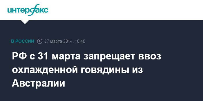 Москва. 27 марта. INTERFAX.RU - Россия с 31 марта запрещает ввоз охлажденной говядины из Австралии в связи с использованием при ее производстве стимулятора роста тренболона, сообщил "Интерфаксу" руководитель Россельхознадзора Сергей Данкверт.