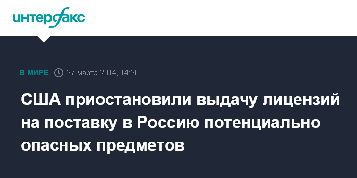 "С 1 марта 2014 года бюро приостановило выдачу лицензий, которые разрешают экспорт и вторичный экспорт предметов в Россию. Запрет будет действовать до дальнейших указаний", - говорится в сообщении, датированном 25 марта. В нем ничего не говорится о характере запрещенных для поставки предметов. По данным Foreign Policy, получения одобрения со стороны бюро требуют также экспорт таких товаров, как химические вещества, программное обеспечение и огнестрельное оружие.