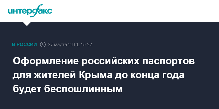 Москва. 27 марта. INTERFAX.RU - Госпошлина за оформление российского паспорта не будет взиматься с жителей Крыма до конца года, заявили в Федеральной миграционной службе.