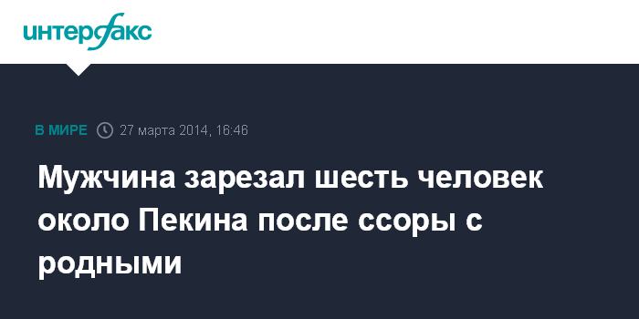 Пекин. 27 марта. INTERFAX.RU - Житель Китая, страдающий психическим расстройством, зарезал шесть человек в пригороде Пекина, сообщает в четверг местная полиция.