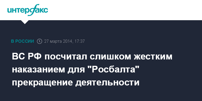 "Применяя к электронному средству массовой информации информационного агентства "Росбалт" такой вид публично-правовой ответственности, как прекращение его деятельности, суд не разрешил вопроса о том, является ли такая мера соразмерной и адекватной содеянному",- говорится в мотивировочной части решение ВС РФ, копия которого имеется в распоряжении "Интерфакса".