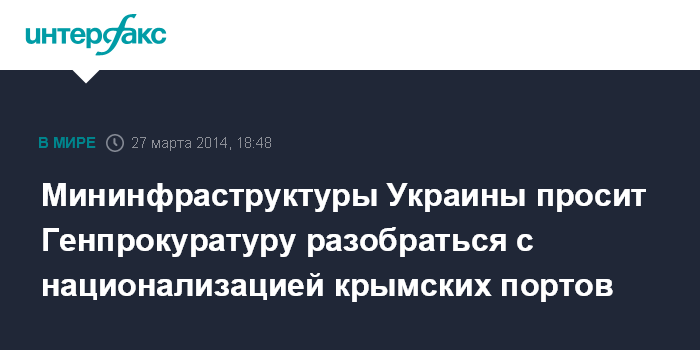 Москва. 27 марта. INTERFAX.RU - Министерство инфраструктуры Украины обратилось в Генеральную прокуратуру в связи с так называемой "национализацией" морских портов в Крыму, сообщил глава министерства Максим Бурбак.