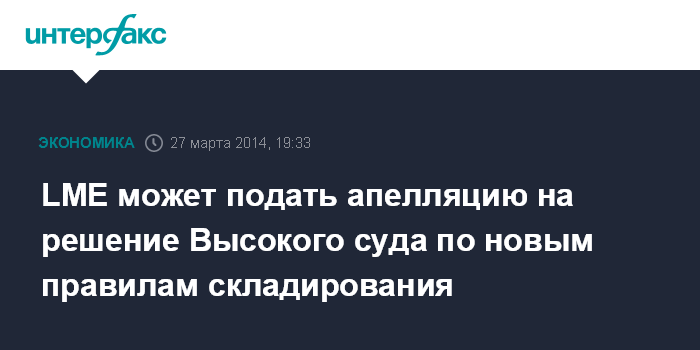 Москва. 27 марта. INTERFAX.RU - Лондонская биржа металлов (LME) рассматривает возможность подачи апелляции на решение Высокого суда Лондона относительно новых правил складирования, принятое по иску ОК "РусАл", говорится в сообщении Гонконгской биржи (HKex), владельца LME с конца 2012 года.