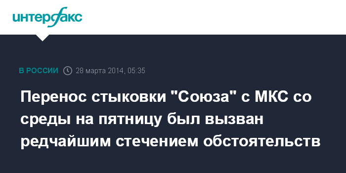 Москва. 28 марта. INTERFAX.RU - Причиной переноса стыковки космического корабля "Союз ТМА-12М" с МКС со среды 26 марта на пятницу 28 марта стал незначительный сбой в системе ориентации корабля, вызванный редчайшим стечением обстоятельств, сообщил руководитель полетом российского сегмента МКС Владимир Соловьев.