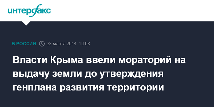 "Мы приняли решение о введении моратория на выдачу земли и приватизацию республиканской собственности. Решение будет действовать до утверждения Генерального плана развития территории Республики Крым, разработка которого поручена Минрегионразвития и Минстрою РФ совместно с крымскими ведомствами", - сообщил Темиргалиев на своей странице в Facebook.