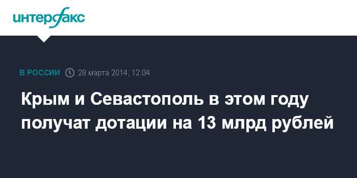 Как отмечается в документе, с учетом текущей ситуации с исполнением бюджетов Республики Крым и города Севастополя предлагается за счет указанных средств предоставить в 2014 году из федерального бюджета дополнительную финансовую помощь бюджету Республики Крым в размере 10,7 млрд рублей и бюджету города Севастополя - 2,4 млрд рублей. Средства будут направлены в виде дотаций на поддержку мер по обеспечению сбалансированности бюджетов субъектов РФ.