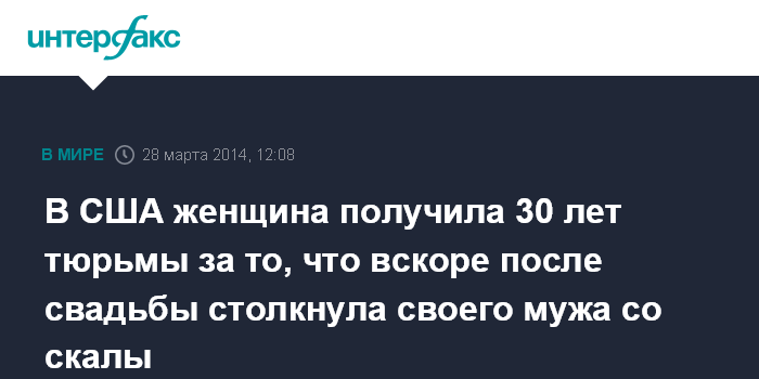 Вашингтон. 28 марта. INTERFAX.RU - Суд в США приговорил к 30 годам тюремного заключения женщину, которая убила своего мужа, столкнув его со скалы спустя всего несколько дней после свадьбы, сообщает в пятницу американский телеканал CNN.