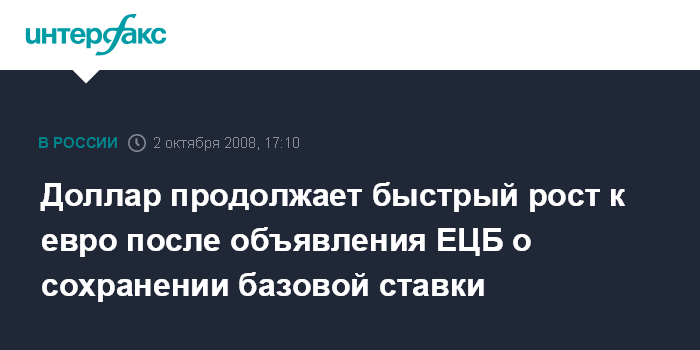 Москва. 2 октября. INTERFAX.RU - Курс доллара продолжает расти к евро после того, как Европейский центробанк (ЕЦБ) заявил о сохранении базовой процентной ставки без изменений - на максимальном за 7 лет уровне 4,25% годовых, сообщает агентство Bloomberg.