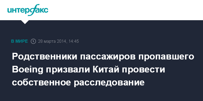 Гонконг. 28 марта. INTERFAX.RU - Родственники пассажиров из Китая, летевших на пропавшем самолете Boeing 777 Malaysia Airlines, направили письмо на имя замглавы МИД КНР Чжан Есуя, в котором призывают Пекин провести собственное расследование трагедии, сообщает сингапурский телеканал Channel NewsAsia.