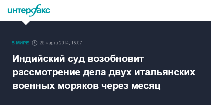Мадрид. 28 марта. INTERFAX.RU - Верховный суд Индии принял решение временно прекратить рассмотрение дела двух итальянских военных моряков, обвиняемых в убийстве индийских рыбаков, сообщает в пятницу итальянская газета Corierre della sera.