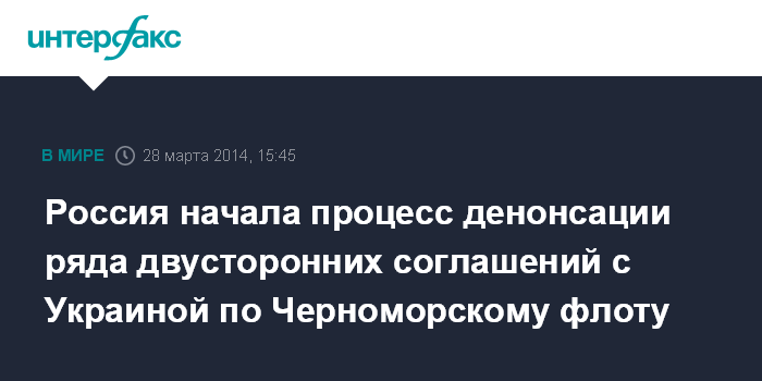 "Наряду с этим на совещании было принято решение о начале процесса денонсации ряда двусторонних российско-украинских документов, а именно соглашения между РФ и Украиной о параметрах раздела Черноморского флота, подписанного в Киеве 28 мая 1997 года; соглашения между РФ и Украиной о статусе и условиях пребывания Черноморского флота РФ на территории Украины, подписанного в Киеве 28 мая 1997 года; соглашения между правительством РФ и правительством Украины о взаиморасчетах, связанных с разделом Черноморского флота и пребыванием ЧФ РФ на территории Украины, подписанного в Киеве 28 мая 1997 года; соглашения между Российской Федерацией и Украиной по вопросам пребывания Черноморского флота РФ на территории Украины, подписанного в Харькове 21 апреля 2010 года", - сказал Песков.