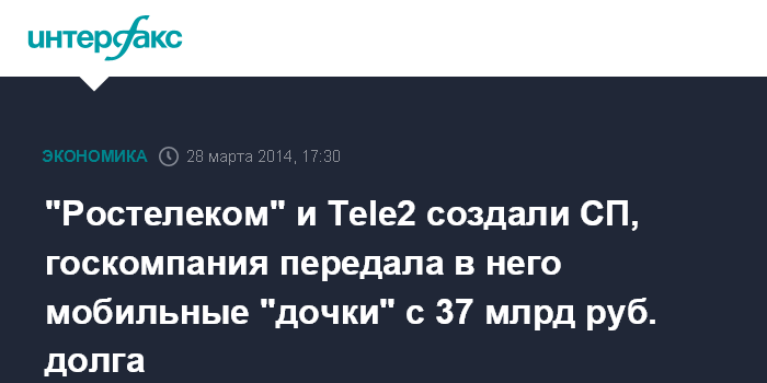 "Ростелеком" и Tele2 создали СП, госкомпания передала в него мобильные "дочки" с 37 млрд руб. долга