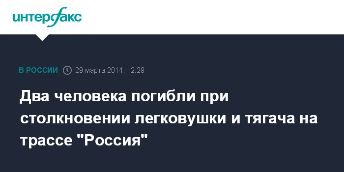 Москва. 29 марта. INTERFAX.RU - При столкновении легковушки и тягача на новгородском участке федеральной магистрали Москва-Санкт-Петербург ("Россия") погибли два человека, сообщил в субботу "Интерфаксу" представитель Новгородского управления МВД.