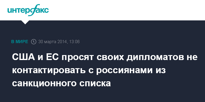 "Наряду с официально объявленными санкциями предпринимаются меры, которые вызывают удивление, когда нашим дипломатам в странах Евросоюза отказывают во встречах в министерствах иностранных дел. Мы знаем, что дипломатам из США и ЕС, находящимся в Москве, направляются инструкции, чтобы они не ходили на мероприятия, на которых появляются люди из санкционного списка",- сказал С.Лавров в интервью программе "Воскресное время" на "Первом канале" .