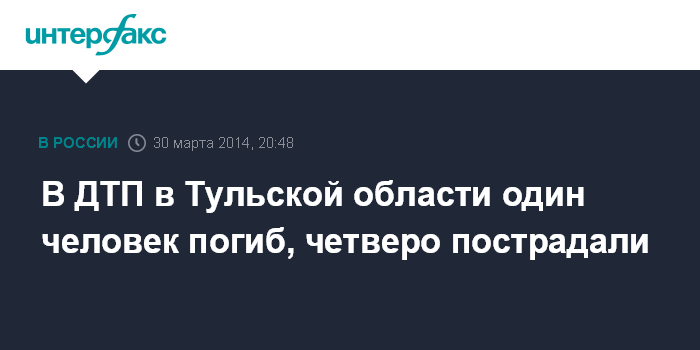 Тула. 30 марта. ИНТЕРФАКС-ЦЕНТР - В результате ДТП с участием шести машин на федеральной трассе "Крым" в Тульской области один человек погиб, четверо пострадали, в том числе двое детей, сообщил "Интерфаксу" руководитель пресс-службы областного УМВД Андрей Ярцев.
