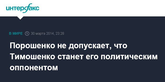 Киев. 30 марта. INTERFAX.RU - Кандидат в президенты Украины Петр Порошенко не допускает, что Юлия Тимошенко станет его политическим оппонентом.