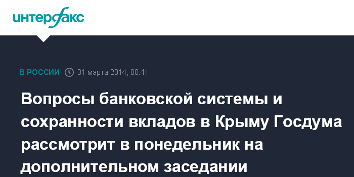 Москва. 31 марта. INTERFAX.RU - Госдума проведет в понедельник дополнительное заседание с тем, чтобы рассмотреть вопросы, касающиеся банковской системы и сохранности вкладов в Крыму и Севастополе.