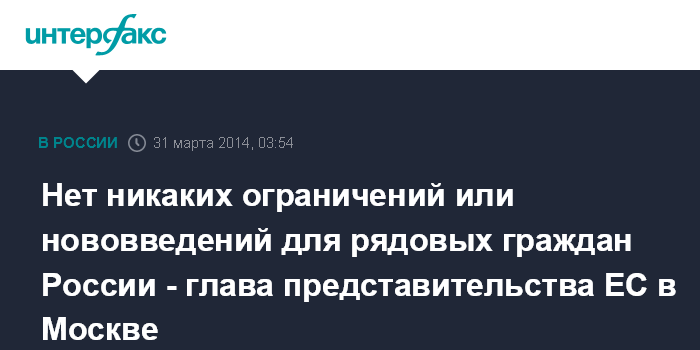"Возможно, это позволит хоть немного преодолеть глубочайшие разногласия между нами - прежде всего, между руководством ЕС и РФ - относительно ситуации вокруг Украины. И я могу заверить вас: в странах ЕС туристам, бизнесменам, ученым и студентам - в общем, обычным людям - из России всегда рады. Там их ждут с распростертыми объятьями и открытыми сердцами", - пояснил глава представительства ЕС в Москве.