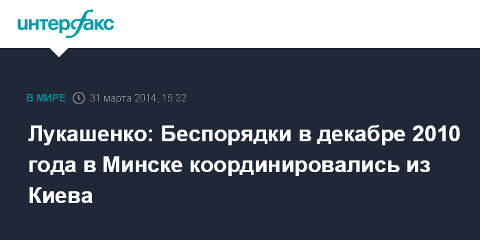 Минск. 31 марта. INTERFAX.RU - Президент Белоруссии Александр Лукашенко заявляет о причастности украинских радикалов к организации массовых беспорядков в Минске после президентских выборов в 2010 году.
