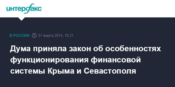 Москва. 31 марта. INTERFAX.RU - Госдума РФ на пленарном заседании в понедельник приняла в первом чтении и в целом закон "Об особенностях функционирования финансовой системы Республики Крым и города федерального значения Севастополя на переходный период".