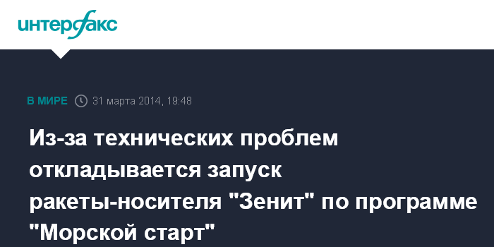 Москва. 31 марта. INTERFAX.RU - Нештатное выполнение операции по "сухому" вывозу ракеты-носителя "Зенит" на плавучий стартовый комплекс, проводившийся в понедельник в базовом порту программы "Морской старт" (Лонг-Бич, США), вынудил перенести запуск, планировавшийся на 16 апреля, сообщили в компании Sea Launch AG.