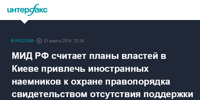 МИД РФ считает планы властей в Киеве привлечь иностранных наемников к охране правопорядка свидетельством отсутствия поддержки населения