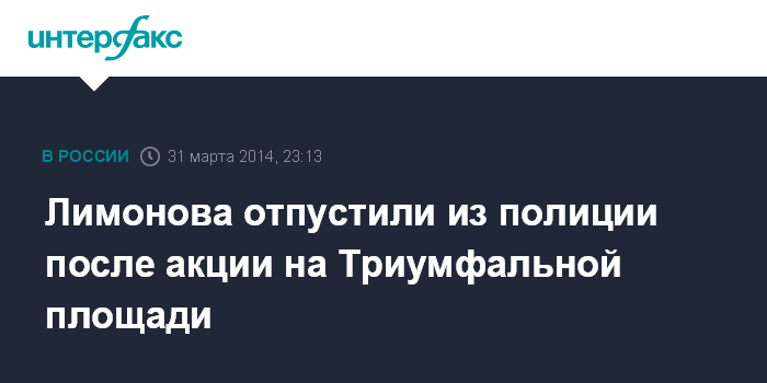 Москва. 31 марта. INTERFAX.RU - Оппозиционера и писателя Эдуарда Лимонова, которого задержали в понедельник за несанкционированную акцию на Триумфальной площади Москвы, отпустили из полиции, сообщил "Интерфаксу" его пресс-секретарь Александр Аверин.