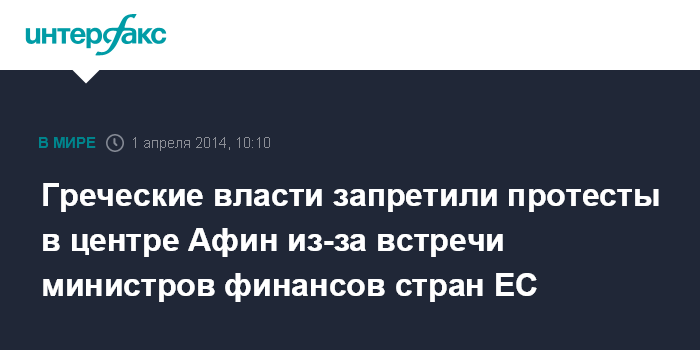 Москва. 1 апреля. INTERFAX.RU - Греческое министерство внутренних дел запретило протесты в центре Афин на время встречи министров финансов стран Евросоюза, передает BBC.
