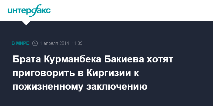 Москва. 1 апреля. INTERFAX.RU - Гособвинение по делу о массовом расстреле митингующих в Бишкеке 7 апреля 2010 года просит суд заочно приговорить брата беглого экс-президента Киргизии Курманбека Бакиева Жаныша к пожизненному заключению.
